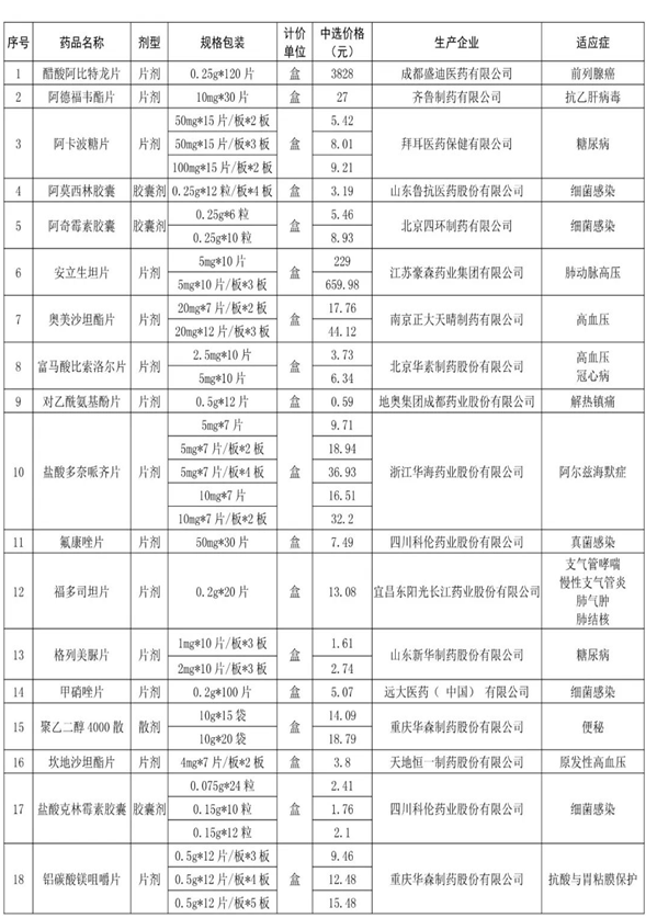 从中选药品降价情况来看,与2018年省采购平台挂网价相比平均降价幅度达74.45%。如常用退热镇痛药对乙酰氨基酚片,规格为0.5g*12片,原挂网价格为14.4元,这次降价后的价格为0.59元,降幅达95.9%;慢性病常用药阿卡波糖规格为0.5g*30片,原挂网价格为61.29元,降价后的价格为5.42元,降幅达91.15%;再如价格昂贵的抗癌药醋酸阿比特龙片规格为0.25g*120片,原挂网价格是12800元,降价后的价格为3828元,降幅达70.09%。